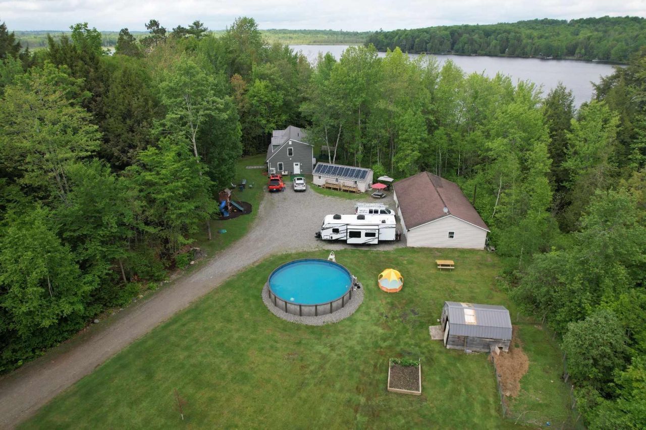 Beautiful 2-3 bedroom home with 2 full baths, beautifully maintained and updated over the years. Spacious living room with propane fireplace, also has pellet stove and heat pumps. Also has guest house for family or friends has 300 sq ft with kitchen living/bedroom and bath. Solar panels 18 total on the guest house that feed back to CMP. 5 car garage, sheds, above ground pool, very well landscaped. Has 635' waterfrontage on Whites Pond. Very private location with 5 acres.